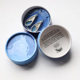 The elegant shape of our Sway Earrings make them an eye catcher. They feature allergy friendly stainless steel hooks, and acquamarine blue acrylic inlays. The wavy pattern softly shines through the inlay, emulating the flow of the ocean.
